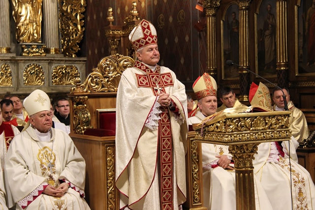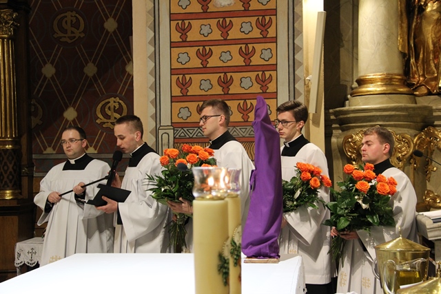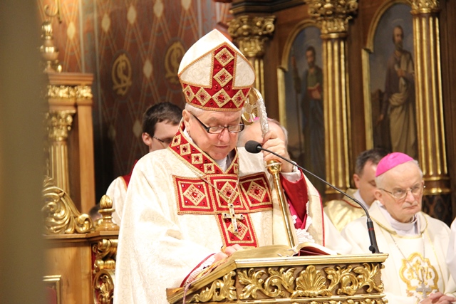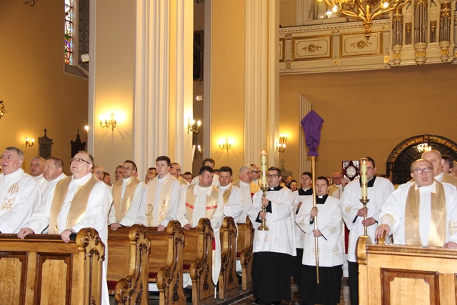 W homilii biskup kaliski zachęcał duchownych do odkrywania na nowo swojego kapłaństwa. – W roku jubileuszowym 25-lecia istnienia diecezji kaliskiej staramy się na nowo odkryć tożsamość kapłańską, aby jeszcze gorliwej pracować w winnicy Pańskiej. Wewnętrzna formacja kapłańska z natury rzeczy nastawiona jest na ciągły rozwój i wzrost – mówił celebrans. Podkreślał, że kapłani poprzez Słowo Boże, sakramenty święte i ewangelizację budują Kościół święty, który jest komunią, a nie organizacją użyteczności publicznej. – Niestety, wielu publicystów wypowiadających się na łamach prasy na temat Kościoła, chciałoby go sprowadzić tylko do jakiejś organizacji charytatywnej lub filantropijnej – powiedział kaznodzieja. Dodał, że akcja charytatywna to tylko jeden z aspektów działalności Kościoła, ważny, ale nie najważniejszy. – Zadaniem Kościoła jest misja zbawienia człowieka i w tę misję musi być wpisane nasze kapłaństwo – stwierdził bp Janiak. Zaznaczył, że współczesny świat jest dotknięty laicyzmem, który eliminuje z życia człowieka obecność Boga, wartości nadprzyrodzone i moralne kryteria oceny postępowania ludzi. – Z drugiej strony mamy do czynienia z fundamentalizmem religijnym, który prześladuje i morduje w imię religii, w imię Boga, co jest niezgodne z elementarnym poczuciem zdrowej religijności. W tę optykę współczesnej cywilizacji i globalizacji wrzucony jest kapłan, aby mimo wszystkich przeszkód głosił Dobrą Nowinę o zbawieniu – wskazywał hierarcha. Prosił wiernych o modlitwę w intencji księży. – Zwracam się do Was, drodzy wierni, abyście swoją modlitwą wspierali swoich duszpasterzy. Przez dobrą i harmonijną współpracę można dokonać wiele szlachetnych dzieł w parafiach, do których należycie. Niech Wasza dyspozycyjność będzie zachętą dla kapłanów, by jeszcze gorliwiej pracowali dla zbawienia dusz – mówił ordynariusz kaliski. Podziękował księżom za posługę w diecezji kaliskiej. – Chciałbym Wam serdecznie podziękować za Waszą pracę dla dobra Kościoła Kaliskiego. Ten Kościół jest Waszą matką, a matkę trzeba kochać i wiernie jej służyć – powiedział bp Janiak. W czasie uroczystej liturgii biskup kaliski poświęcił krzyżmo oraz oleje chorych i katechumenów.