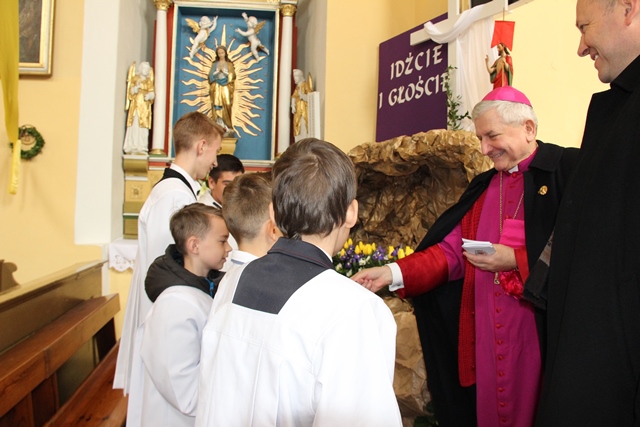 Witając biskupa i wiernych ks. Waldemar Willak wskazał, że obecna murowana świątynia została wzniesiona w połowie XVII w. Dodał, że wyposażenie pochodzi z kościoła Świętego Krzyża na Ostrowskim Tumskim we Wrocławiu. Zaznaczył, że w ołtarzu bocznym znajduje się płaskorzeźba z 1499 r. autorstwa uczniów Wita Stwosza. Proboszcz podkreślił, że dzięki pozyskaniu środków unijnych świątynia została gruntownie wyremontowana. Poprosił biskupa kaliskiego o poświęcenie kamiennego ołtarza i ambony.