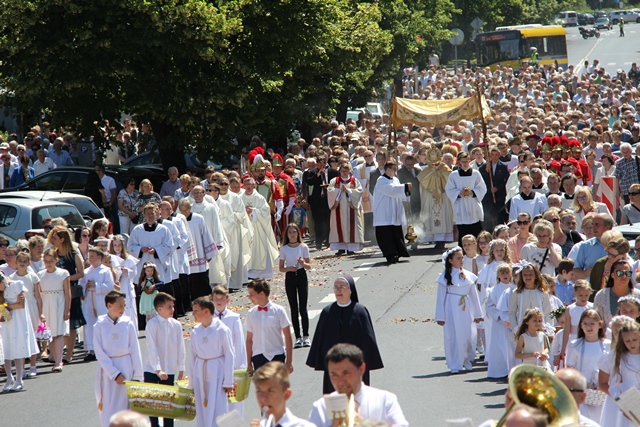 Zachęcał wiernych, aby zaprosili Jezusa do swojego życia. – Dziękujmy Panu Bogu, że możemy uczestniczyć w tej pięknej uroczystości Bożego Ciała i zaprośmy Go do swojego serca, do swoich rodzin, niech nam błogosławi w dalszym pielgrzymowaniu – powiedział bp Janiak.