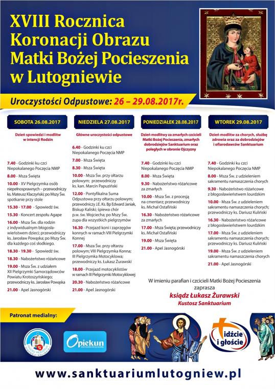 Szczegółowy program uroczystości na plakacie i stronie internetowej: http://www.sanktuariumlutogniew.pl/