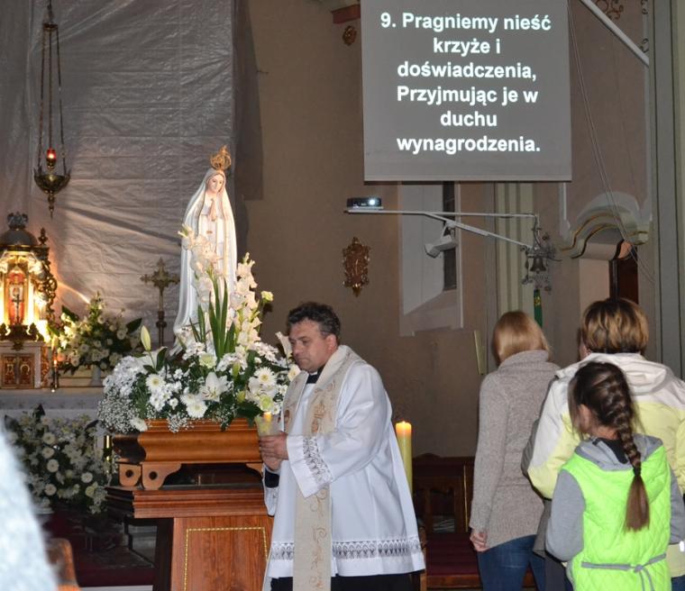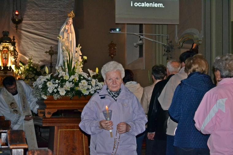 Kolejne postanowienia dotyczyły codziennej modlitwy do Ducha Świętego, a także obrania Maryi za Królową naszych serc. Podczas odmawiania piątej tajemnicy w świątyni zapłonęły lampiony przyniesione przez wiernych. Zostały one zapalone od świecy jubileuszowej stojącej przy figurze Fatimskiej Pani. Następnie odmówiliśmy modlitwę Anioła i ze śpiewem na ustach z zapalonymi lampionami wyruszyliśmy figurą Fatimskiej Pani z procesją wokoło kościoła. W tym czasie rozległ się dźwięk dzwonów, który przypomina nam o tym, by stanąć do Apelu Jasnogórskiego. Towarzyszy nam on od czasu nawiedzenia naszej parafii przez Czarną Madonnę w 2011 roku. Po powrocie do kościoła został odśpiewany Apel Jasnogórski . Maryjo: jesteśmy, pamiętamy, czuwamy- to wyznanie popłynęło ku niebu z naszego parafialnego wieczernika. Modlitwą w ten wieczór objęliśmy także zgromadzonych w polskiej Fatimie na zakopiańskich Krzeptówkach Kustoszy Sanktuariów i uczestników Międzynarodowego Kongresu Maryjno- Mariologicznego.