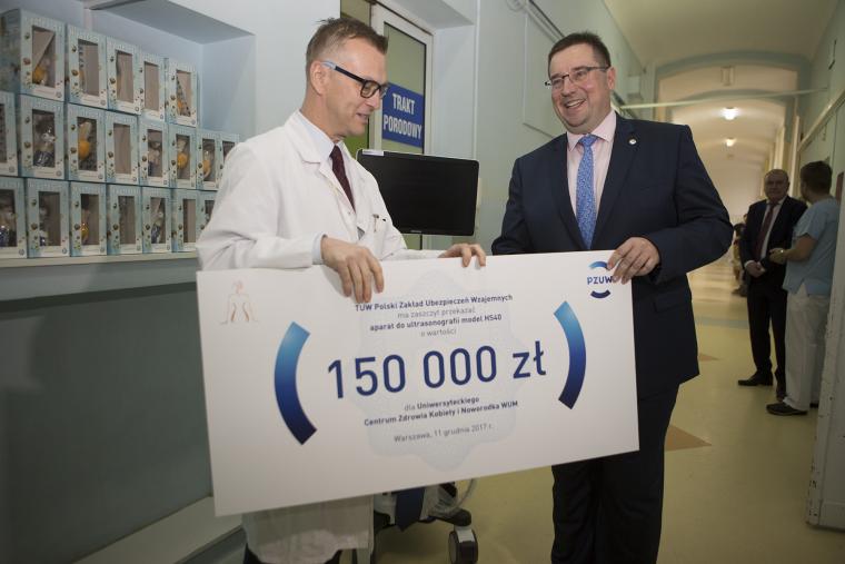 Dzięki TUW PZUW, Centrum Zdrowia Kobiety i Noworodka Warszawskiego Uniwersytetu Medycznego w Warszawie, a przede wszystkim pacjentki i ich dzieci, zyskali najwyższej klasy urządzenie. Aparat USG będzie wykorzystywany do śródporodowego monitorowania stanu zdrowia rodzącego się dziecka. Sprzęt w ręce prof. dr hab. n. med. Mirosława Wielgosia, rektora Warszawskiego Uniwersytetu Medycznego pod auspicjami którego działa Uniwersyteckie Centrum Zdrowia Kobiety i Noworodka WUM w Warszawie, uroczyście przekazali Rafał Kiliński, prezes zarządu TUW PZUW i Aneta Zawistowska, członek zarządu TUW PZUW.