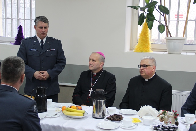 Wizytę w Areszcie Śledczym rozpoczęło spotkanie z pracownikami. Gości powitał dyrektor kpt. Waldemar Zaremba. Po odczytaniu Ewangelii o Bożym Narodzeniu przez ks. kan. Krzysztofa Nojmana, proboszcza konkatedry, słowo do pracowników aresztu skierował bp Łukasz Buzun, który przypomniał, że 6 stycznia kończy się obchodzony w diecezji kaliskiej Nadzwyczajny Rok Świętego Józefa Kaliskiego. - Chciałbym, aby św. Józef, który jest patronem diecezji był opiekunem tego miejsca i każdego z was. Św. Józef to człowiek szczery, prosty, otwarty, zdecydowany w swoim działaniu, słuchający głosu Bożego. Życzę, aby te święta wnosiły dużo pokoju w serca i by ten dobry klimat świąteczny był przekazywany w środowisku pracy – mówił duchowny.