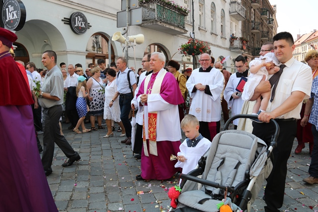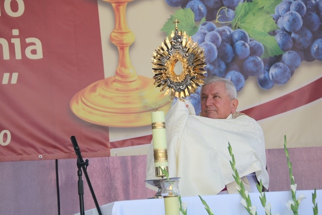 Prosił zgromadzonych, aby zaprosili do swojego życia Boga. - W to piękne święto Ciała i Krwi Pańskiej tutaj na ołtarzu składamy wszystkie troski, ale też przywary i błędy wypraszając Boże błogosławieństwo. Chciejmy Pana Boga zaprosić do naszych rodzin, do naszych serc, byśmy z mocą i siłą wytrwali w dźwiganiu codziennego krzyża, a to ziemskie pielgrzymowanie czy nam się podoba czy nie kiedyś skończy się – podkreślał kaznodzieja.
