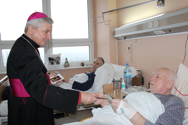 Biskup odwiedził pacjentów oddziału chirurgii ogólnej i przewodu pokarmowego, a pozostali kapłani przełamali się opłatkiem z chorymi leżącymi na wszystkich oddziałach kaliskiego szpitala.