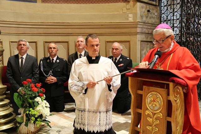 Wraz z biskupem kaliskim Edwardem Janiakiem modlili się: ks. prał. Jacek Plota, kustosz Narodowego Sanktuarium św. Józefa, ks. kan. Paweł Jabłoński, kapelan strażaków powiatu kaliskiego, ks. kan. Piotr Kuświk, kapelan strażaków powiatu ostrowskiego i ks. kan. Krzysztof Duchnowski, kapelan biskupa.