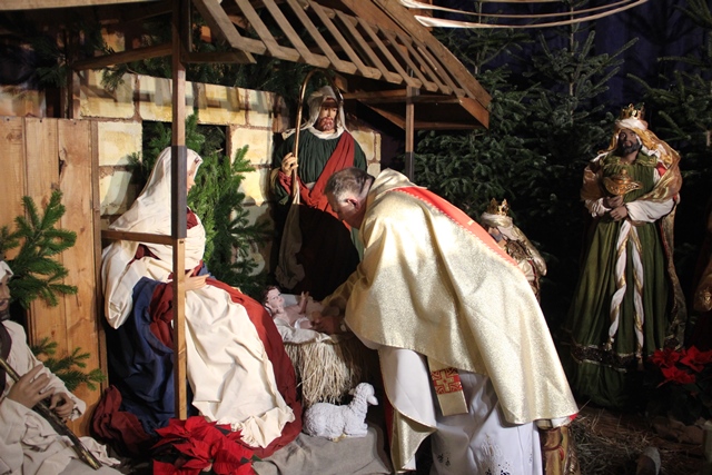 Przed rozpoczęciem Eucharystii w procesji bp Stanisław Napierała zaniósł figurkę Dzieciątka do żłóbka.