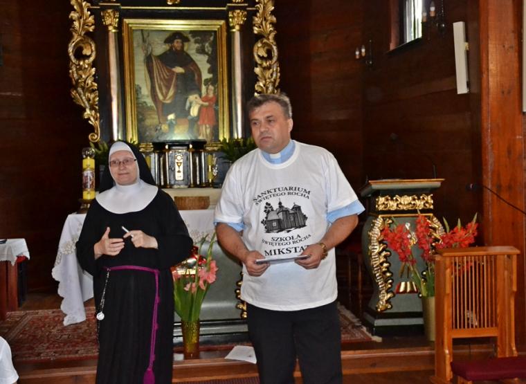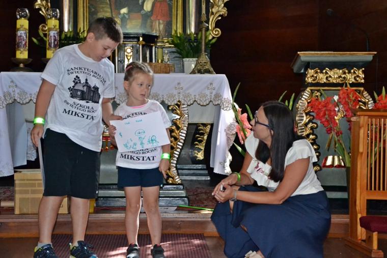 Trwają przygotowania duchowe do uroczystości odpustowych ku czci św. Rocha w Mikstacie. Mimo wakacyjnego, sobotniego dnia dzieci w godzinach przedpołudniowych przyszły na kolejne spotkanie w ramach VIII edycji Szkoły Świętego Rocha. Spotkanie rozpoczęło się modlitwą . Był w czasie tego spotkania czas na śpiew i zajęcia na świeżym powietrzu. Ich organizacją zajęła się s. Małgorzata. Były kolejne informacje o życiu św. Rocha. Święty Roch był pielgrzymem, a jego pielgrzymi szklak prowadził przez Francję i Włochy. Więc były w Rochowej Szkole zajęcia językowe. Poprowadziła je Pani Iza. Poprzez tegorocznej Szkoły młodzi poznają dziedzictwo kulturowe. W sobotnie przedpołudnie odbyli wirtualną wędrówkę szlakiem kapliczek, figur i krzyży przydrożnych znajdujących się w Mikstacie. Niespodziankę dla uczestników Rochowych spotkań przygotował ich inicjator i organizator ks. kan. Krzysztof Ordziniak. Jaką? Każde dziecko otrzymało „firmową” koszulkę Szkoły Świętego Rocha. Pięknie się w nich prezentują.