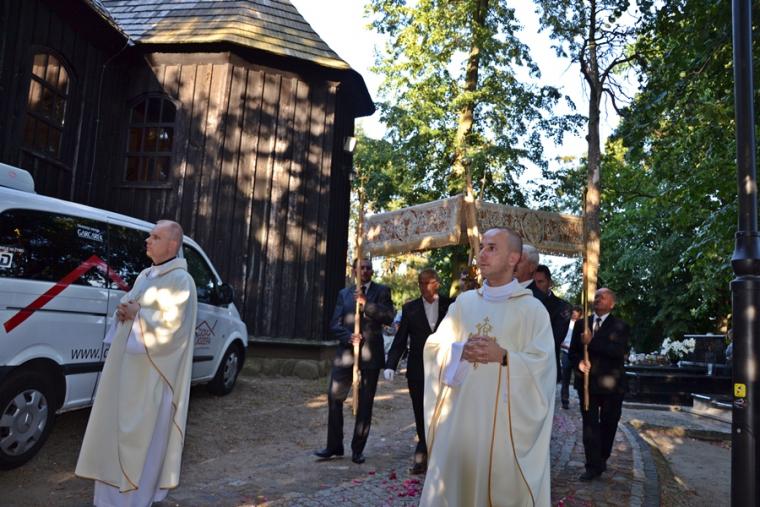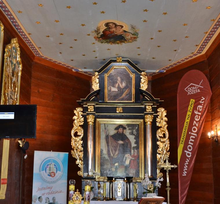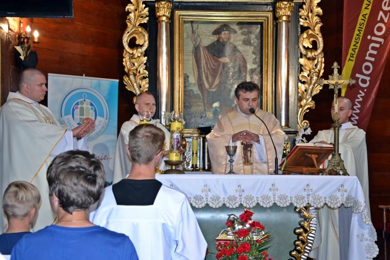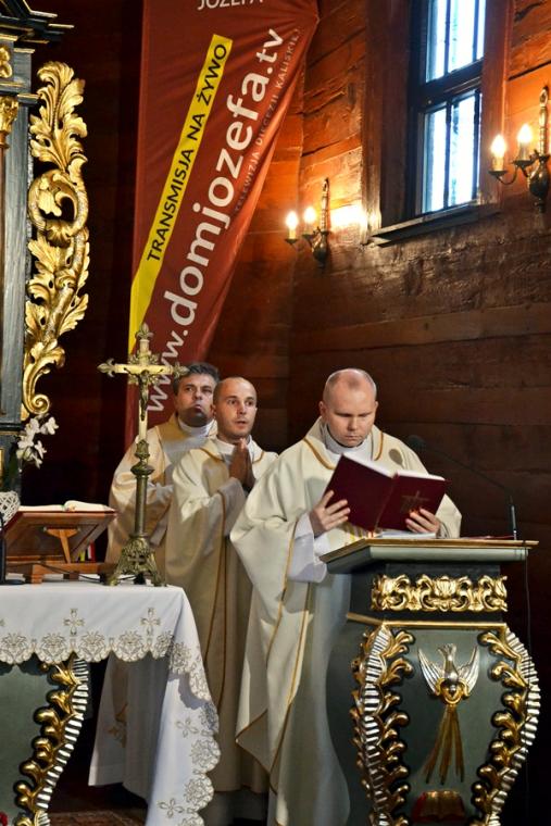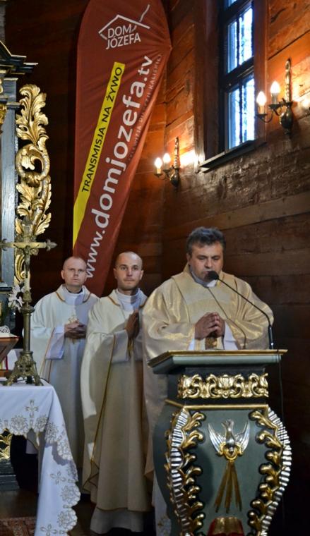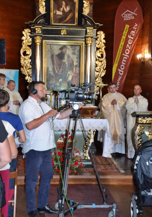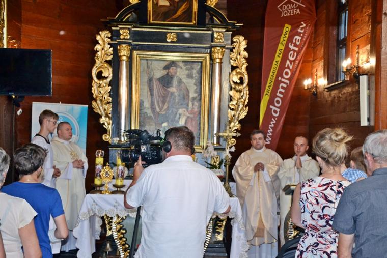 Jest tradycją w mikstackiej wspólnocie parafialnej, że w poniedziałki w Diecezjalnym Sanktuarium Świętego Rocha sprawowana jest msza święta, a po niej nabożeństwo do św. Rocha. Uczestniczy  w nim wielu parafian. W poniedziałek, 24 czerwca było ich znacznie więcej. Nie wszyscy uczestniczyli w nim bezpośrednio, ale wielu włączyło się w nie duchowo, gdyż w tym dniu w ramach czwartych poniedziałków miesiąca przeprowadzona została na żywo transmisja radiowo- telewizyjna przez Radio Rodzina i TV Internetową Dom Józefa. Gościliśmy  w tym dniu w sanktuarium Dyrektora Diecezjalnego Radia Rodzina i TV Internetowej Dom Józefa ks. Mateusza Puchałę, pochodzącego z naszej parafii. Wraz z ks. Mateuszem przybył ks. Szymon  Rybak, który był w naszym sanktuarium po raz pierwszy i pewnie nie ostatni, bo tak jak wielu je nawiedzających i on nie oparł się jego urokowi. Mszy świętej przewodniczył kustosz miejsca ks. kan. Krzysztof Ordziniak, który polecał pracowników naszych mediów, prosił dla nich o światło Ducha Świętego. Wraz z ks. kustoszem przy ołtarzu stanęli ks. Mateusz, ks. Szymon i ks. wikariusz Marcin Walczak, którzy polecali Bożemu miłosierdzi zmarłych z naszej parafii.