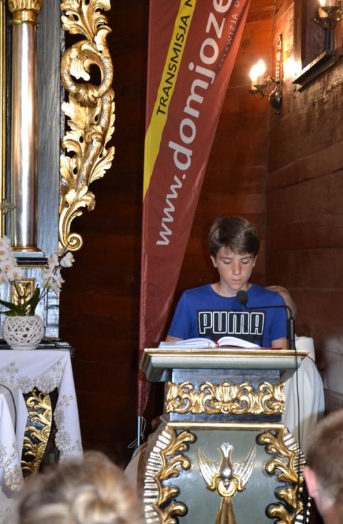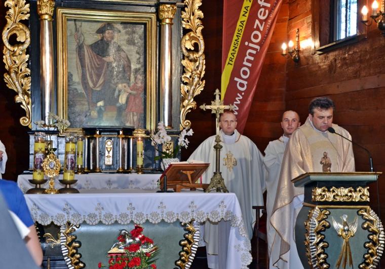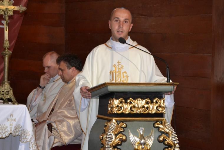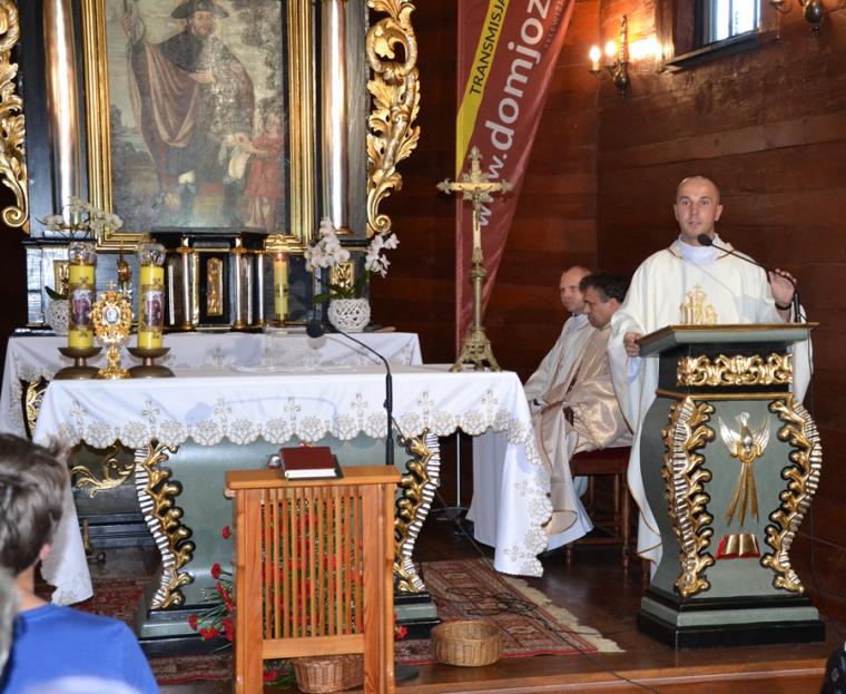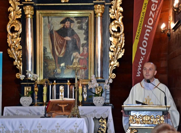 Homilię podczas tej Eucharystii wygłosił  ks. Mateusz Puchała. Nawiązując do obchodzonej uroczystości narodzin św. Jana Chrzciciela podkreślił, że z wyjątkiem Najświętszej Maryi Panny  jest on jedynym świętym, którego narodziny obchodzone są liturgicznie gdyż są związane z tajemnica wcielenia Syna  Bożego. Kaznodzieja zaznaczył, że zostało mu powierzone konkretne zadanie. Co to znaczy być chrześcijaninem? Co to znaczy być świadkiem Jezusa Chrystusa, być światłością dla pogan- to pytania, które warto sobie postawić w kontekście przeżywanej uroczystości. Ks. Mateusz zaznaczył, że Kościół stawia nam w tym dniu postać wielkiego człowieka. Dodał, że nie chodzi jednak byśmy się nim tylko zachwycali, ale naśladowali go w naszym życiu. Wskazał, że powinniśmy uczyć się od św. Jana Chrzciciela jak żyć, postępować, jak służyć Panu Bogu, Kościołowi i bliźnim. W dalszej homilii części kaznodzieja podkreślił, że warto sobie postawić pytanie kim był św. Jan Chrzciciel i jakie było jego życie. Nawiązując do aklamacji zaakcentował, że całe jego życie było poświęcone Panu Bogu, nawoływał do nawrócenia, przygotowywał serca ludzi na przyjście Pana. Prawość i posłuszeństwo słowu Bożemu to kolejne cechy św. Jana Chrzciciela, które wskazał kaznodzieja. Nie bał się upomnieć króla Heroda, który źle postępował, mimo iż wiedział gdzie jest dobro. „Czyż Herod nie jest ikoną, czy obrazem każdego człowieka, który wie dobrze gdzie jest dobro, ale nie ma dość siły i odwagi, aby je w swoim życiu spełnić” – pytał kapłan i dodał  „ Słyszymy przecież każdego dnia nauczanie naszych pasterzy. Nasi kapłani nauczają, że należy uczestniczyć we mszy świętej, że nie wolno robić zakupów w niedzielę, nie wolno grzeszyć przeciwko miłości małżeńskiej, miłości  rodzinnej, nie wolno kraść, oszukiwać w pracy, w szkole”. Wskazał, że często udajemy, że nas te problemy nie dotyczą, zagłuszamy swoje sumienie, tłumacząc sobie, że jesteśmy wolni. Czego możemy się uczyć od św. Jana Chrzciciela - to kolejne pytanie, które postawił kaznodzieja? Zaznaczył, że jest on przestrogą dla współczesnych ludzi, którym brakuje wierności Chrystusowi. Ubolewał, że wielu ludziom brakuje wierności poglądom, swoje postawy uzależniamy często od sytuacji. Ks. Mateusz podkreślił, że Jezus potrzebuje świadków bezkompromisowych, autentycznych. Ponadto kapłan zwrócił uwagę, że św. Jan Chrzciciel był człowiekiem radykalnym, bezkompromisowo głoszącym Chrystusową prawdę. Kontynuując kaznodzieja zachęcał  słuchaczy homilii do postawienia pytania o swoją wiarę, o swoje sumienie. Kim dla Ciebie jest naprawdę Jezus Chrystus to pytanie, na które powinien odpowiedzieć każdy uczestnik modlitewnego spotkania. Kapłan podkreślił, że gdy udzielimy sobie na nie odpowiedź powinniśmy podjąć refleksję nad tym,  jak  ta deklaracja przekłada się ona na nasze codzienne życie. Ważne jest – podkreślił kaznodzieja- by była to odpowiedź szczera, byśmy odpowiedzieli sobie na pytanie, czy inni patrząc na nasze życie widzą w nas uczniów Jezusa. Świadczenie o Jezusie słowem ale przede wszystkim  życiem jest nasza powinnością. Współczesny świat potrzebuje autentycznych świadków Jezusa. Kapłan powiedział: „Jezus pragnie Twojej i mojej wierności. Jezus pragnie Twojej i mojej wierności w tych ,małych, drobnych, prozaicznych  rzeczach, ale także  w wielkich sprawach, w których również uczestniczymy”. Kontynuując kapłan zachęcał byśmy prosili św. Jana Chrzciciela był dla nas wzorem w codziennym opowiadaniu się za Panem Bogiem. Nasza postawa powinna być mówieniem o Bogu, powinna być zgodą na pełnienie Jego woli.Wierności powołaniu i wypełnianie go do końca możemy uczyć się patrząc na życie św. Jana Chrzcielna. Kaznodzieja wskazał na wielość powołań, którymi Bóg obdarza ludzi i zwrócił uwagę na potrzebę wierności temu powołaniu. Zachęcał, byśmy patrząc na przykład św. Jana Chrzciciela i św. Rocha przyprowadzili jak najwięcej ludzi do Pana Boga i do Kościoła. Powinniśmy być apostołami, którzy przykładem swego życia staną się inspiracją do stawiania sobie przez innych pytania o motywy naszego postępowania. Kończąc kaznodzieja powiedział: „Niech ta dzisiejsza uroczystość narodzenia św. Jana Chrzciciela, niech ta nasza wspólna modlitwa tutaj  w Diecezjalnym Sanktuarium Świętego Rocha pomoże nam wzrastać w wierze, pomoże nam umocnić  naszą relację z Panem  Bogiem abyśmy dzisiaj po wyjściu tej świątyni stali się odważniejszymi, a przede wszystkim autentycznymi świadkami Jezusa Chrystusa. Amen”.