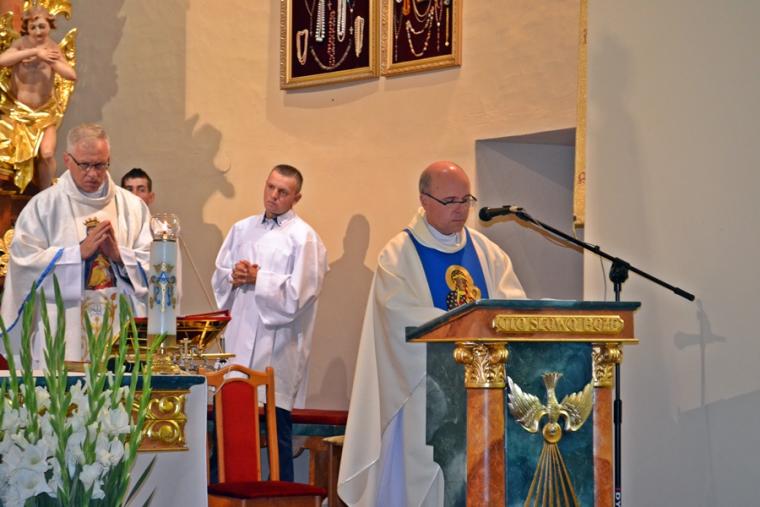 Przed rozpoczęciem Eucharystii słowa podziękowania za przybycie skierował do zebranych w sanktuarium ks. kan. Adam Kosmała. Zachęcał wiernych do przedstawiania Maryi swoich próśb o potrzebne łaski. Podziękował parafianom za przygotowanie kościoła do uroczystości odpustowych, podkreślając, że to dzięki ich zaangażowaniu prezentuje się on tak pięknie. Po odsłonięciu obrazu rozpoczęła się suma odpustowa. Sumę odpustową koncelebrowało czterech kapłanów. Koncelebrze przewodniczył ks. kan. Jacek Stawik, proboszcz parafii Jaraczewo. Współcelabransami byli ks. kan. Krzysztof Ordziniak, ks. kan. Przemysław Talaga i ks. Paweł Wczesny. W czasie sumy homilię wygłosił ks. kan. Jacek Stawik. Rozpoczynając podkreślił, że lektura Pisma Świętego pokazuje,że Pan Bóg chce na ziemi miejsc, w których będzie szczególnie obecny, w którym będą gromadzili się wierni jako lud, jako bracia, jako rodzina. Zaakcentował, że takim miejscem jest Kotłowskie Wzgórze. Przyznał, że sam to miejsce dopiero odkrywa. Podzielił się swoimi lękami, niepokojami związanymi ze wspomnieniami z początków podziału kościoła. Przyznał, że bał się tego miejsca, a jak podkreślił jest ono piękne, przepełnione miłością, bo jest domem Matki. Tutaj, jak podkreślił czcimy Ją, pozdrawiamy, ale także poznajemy, doświadczamy, że Jej życie miało głęboki sens, zostało uhonorowane chwałą nieba i przebywaniem przy Bogu. Nawiązując do przeżywanej uroczystości kaznodzieja przypomniał, że w liturgii wspominamy dzień narodzenia Maryi. Kontynuując powiedział: „ Liturgia jest czymś niezwykłym. Jest działaniem Boga i naszym. My się gromadzimy mając dobrą wolę, coś czytamy, mówimy, wykonujemy biblijne gesty, a Bóg działa i czyni obecnym to wszystko co się już wydarzyło. Dodał, że liturgia dnia dzisiejszego przenosi nas w dzień narodzin, który jest dniem radości i wielkiego szczęścia. Ks. kan. Jacek zaakcentował, że Maryja była jutrzenką, czyli Tą, która poprzedza słońce, Tą, która porodzi Zbawiciela. Nawiązując do słów Ewangelii- rodowodu Jezusa Chrystusa podkreślił, że jest w nim wiele ważnych, cennych informacji. Zawiera on tajemnice powołania. Zwrócił uwagę, że współczesny człowiek żąda świata idealnego. Okazuje się jednak, że w opisie rodowodu Jezusa nie występują osoby, które wcale nie były idealne, nie były święte. Podkreślił, że na początku i na końcu opisu rodowodu są osoby święte: Abraham, którego wiara jest dla nas wzorem i Maryja. Kontynuując kaznodzieja zwrócił uwagę, że my także wpisujemy się w ten rodowód, gdyż Zbawca ciągle się objawia. Ks. kan. Jacek zachęcał zebranych, by podjęli refleksję nad tym jak wpisują się w ten rodowód. Dodał, że dobrze będzie zapytać Maryi, jak wpisać się w ten rodowód. Podkreślił, że Maryja prowadziła proste, zwyczajne życie, w które wpisana była pokora, radości, cierpienia. Jej życie przepełnione było szacunkiem i miłością do Józefa. Kontynuując kaznodzieja podkreślił, że prawdziwym pięknem Maryi jest prawda. Powiedział: „ Bóg jest Bogiem, Ona jest człowiekiem. Wie, że wszystko pochodzi od Boga. Jest pokorną służebnicą”. Zwrócił uwagę, że źródłem Jej piękna było słowo Boże, które rozważała, którego słuchała i które przyjmowała i realizowała w swoim życiu. W dalszej części homilii celebrans z naciskiem podkreślił, że Bóg jest w niebie, nikt z nas nie jest Bogiem. Skierował do zebranych w świątyni pytanie jak ta prawda, że Bóg jest tylko jeden porządkuje ich życie. Tą prawdą- jak podkreślał żyła Maryja, dlatego powinniśmy się Nią zachwycać. Kontynuując powiedział: „Ciągle jesteśmy na jakimś rozdrożu, jesteśmy karmieni różnym rzeczami, różnymi sprawami. Jesteśmy nieraz karmieni dziełami ciemnymi, wypalonymi, pustymi. Stąd wiele beznadziejności”. Podkreślił, że czasy współczesne są największym kryzysem cywilizacyjnym. Zaakcentował, że człowiek współczesny ma tendencję do urządzania świata na nowo, odrzucając Pana Boga. Kontynuując dodał, że jesteśmy uwikłani w ten kryzys cywilizacji i nie pozostaje on bez wpływu na nasze życie. Podkreślił, że fakt iż jesteśmy u Matki Bożej wskazuje, że kroczymy drogą prawdziwą, tą, która zaprowadziła Maryję do królowania w niebie.