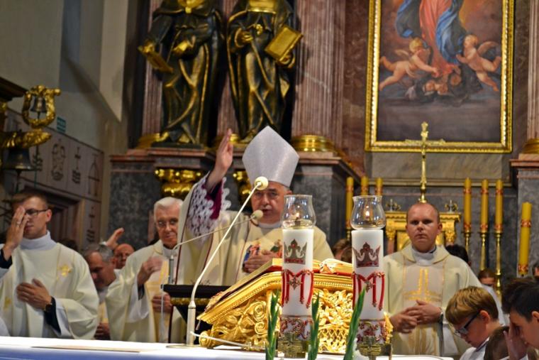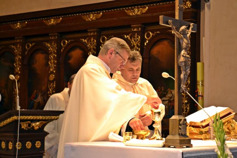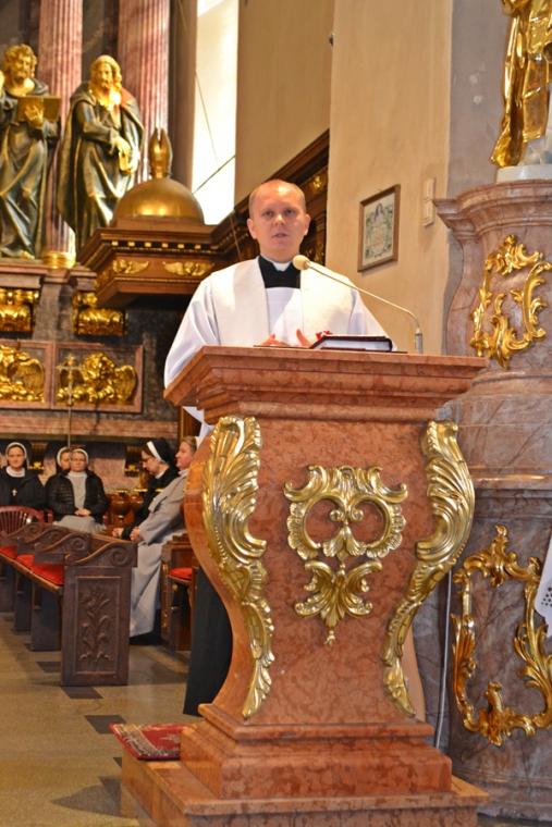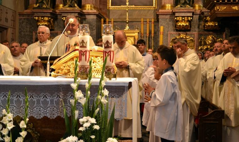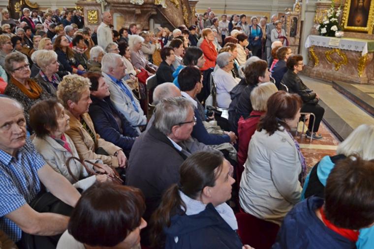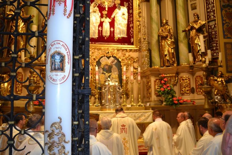 Po konferencji w Kaplicy Cudownego Obrazu zostało odprawione nabożeństwo do św. Józefa, które poprowadził ks. Michał Świgoniak. Ku niebu popłynęły słowa powitania św. Józefa, podziękowania za otrzymane łaski, ale także prośby, które w sobotnie przedpołudnie zostały złożone w sanktuarium. Po nich odmówiona została Litania do św. Józefa. Gdy zegar na wieży wybił godzinę dwunastą odśpiewany został Anioł Pański. Po modlitwie ks. prałat Jacek Plota, skierował słowa powitania do pielgrzymów. Najważniejszym punktem sobotniego spotkania ze Świętym Józefem była Eucharystia. Przewodniczył jej ks. prałat Jacek Plota, kustosz tego wyjątkowego miejsca, a współcelebransami kapłani przybyli z wiernymi ze swoich parafii. Homilię podczas Mszy św. wygłosił ks. Szymon Rybak. Rozpoczynając podkreślił, że nie jest przypadkiem, że znaleźliśmy się w Narodowym Sanktuarium Świętego Józefa właśnie w tym dniu. Zachęcał do tego, by poszukać samodzielnie odpowiedzi na pytania, po co się tutaj znaleźliśmy? Co św. Józef chce powiedzieć każdemu z nas? Nawiązując do słów Ewangelii (Łk8,4-15) podkreślił, że Pan Bóg jest tym, który sieje Słowo, niezależnie od tego, gdzie ono padnie, mając nadzieję, że wyda ono plon. Zaznaczył, że patrząc na życie św. Józefa widzimy, że jest ono żyzną glebą. Następnie ks. Szymon przywołał historię którą kiedyś usłyszał, a dotyczyła ona pytania, jakie konająca matka postawiła synowi kapłanowi: Czy ty naprawdę, żyjesz z Jezusem? Matka podkreśliła, że nie pyta syna kim jest, jakie ma znajomości, jaką ma władzę, ale czy naprawdę żyje z Jezusem. Kontynuując kaznodzieja podkreślił, że nie interesują go znajomości, pozycja społeczna, status materialny, decyzje, które mają do podjęcia zebrani w sanktuarium, ale interesuje go to czy naprawdę żyją z Jezusem. Jednocześnie podkreślił, że nie chodzi tutaj o deklaracje, ale o autentyczne życie wiarą. Ks. Szymon zachęcał, by szukać odpowiedzi na pytanie: kim jest dla nas Jezus, ale nie w deklaracji, tylko w konkretnych sytuacjach życiowych, podczas spotkań z różnymi ludźmi, w podejmowanych decyzjach. Podkreślał, że patrząc na św. Józefa widzimy, że nie składał Bogu wielkich deklaracji, ale cały czas żył słowem Bożym, mówił Bogu o swoich lękach.