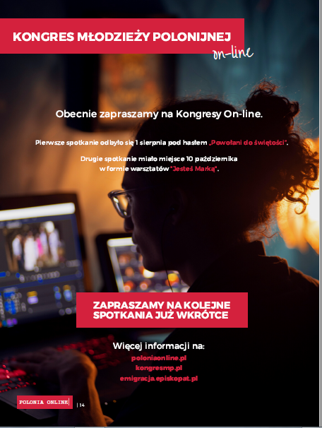 3 grudnia br. odbył się Kongres Młodzieży Polonijnej za pośrednictwem platformy Zoom. Temat Kongresu brzmiał: „Bóg, Honor, Ojczyzna. Czy polskość ma sens?”. Wzięło w nim udział młodzi ludzie m.in. z Niemiec, Francji, Grecji, Norwegii, Australii, USA, Włoch i Anglii. Spotkanie zakończyło się zachętą do udziału w Światowych Dniach Młodzieży w Lizbonie, który dla młodych będzie okazją do bycia we wspólnocie, doświadczenia Kościoła pełnego entuzjazmu i mającego przyszłość.