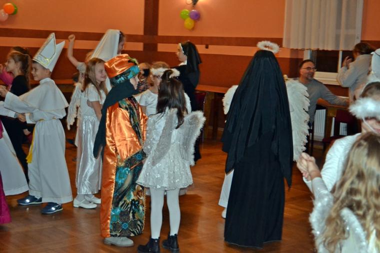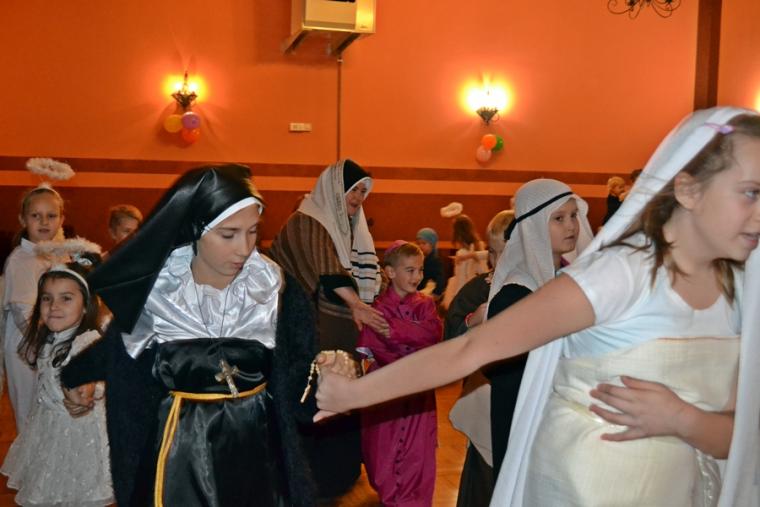 Tu  w MGOK- u odbył się mikstacki Bal Wszystkich Świętych. Tak jak na prawdziwym balu było zaproszenie do pierwszego tańca, który poprowadziła Maryja. Po pierwszym tańcu odbyła się prezentacja „ Świętych”  uczestniczących w balu. Najliczniejszą grupę stanowiły Anioły. Była na balu wspomniana już Maryja, były święte siostry zakonne, a wśród nich Apostołka Bożego Miłosierdzia Faustyna. Trzech chłopców przebrało się za św. Jana Pawła II. Na mikstackim Balu Wszystkich Świętych bawiły się m.in. św. Zofia, Jadwiga, Cecylia,  Marta, Matka Teresa z Kalkuty, ale także dzieci fatimskie.  Nie zabrakło Kacpra, Melchiora, Baltazara, św. Marka. Dobrze bawił się na balu pierwszy papież św. Piotr, który w dłoniach trzymał klucze. Był też założyciel Zgromadzenia Sióstr Franciszkanek Rodziny Maryi św. abp Zygmunt Szczęsny Feliński. Jego duchowe córki wcieliły się w postacie biblijne: Mojżesza i Nikodemy. Wszystkich Świętych uczestników mikstackiego trudno wymienić. Po prezentacji zabrzmiały ponownie dźwięki muzyki. Święci, to ludzi uśmiechnięci, więc kontynuowali radosną zabawę. Nie zabrakło konkursów i słodkości.