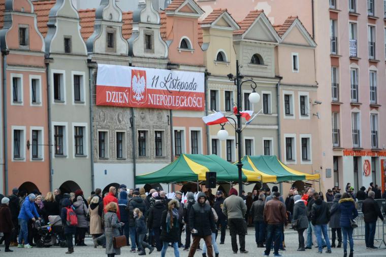 Druga część uroczystości miała miejsce na legnickim Rynku. Na maszt wzniesiono polską flagę i odśpiewano hymn narodowy. Uczniowie pierwszych klas mundurowych VII LO złożyli swoje ślubowanie. Następnie odbyła się prezentacja X Brygady Kawalerii Pancernej im. gen. broni S. Maczka w Świętoszowie, Państwowej Straży Pożarnej, Policji, Straży Granicznej, Żandarmerii Wojskowej. Z koncertami wystąpiła Dziecięco-Młodzieżowa Orkiestra Dęta oraz Legnicka Orkiestra Dęta. Odbył się także „Korowód Niepodległości”, ułożono również „żywą flagę”. Można też było uczestniczyć w widowisku teatru Avatar. Dla uczestników święta przygotowano także warsztaty tworzenia kotylionów, stoiska gastronomiczne oraz wiele innych atrakcji.