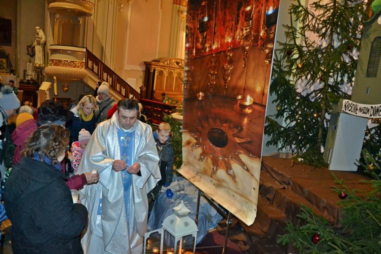 Po zakończeniu mszy świętej, przy banerze przedstawiającym Grotę Narodzenia Pana Jezusa ks. proboszcz zapalał świece, lampki przyniesione przez wiernych. Wiele osób zabrało do swoich domów Betlejemskie Światło Pokoju. Stojące przy ołtarzu w kościele i zaniesione do naszych domów Betlejemskie Światło Pokoju przypomina nam, że Pan jest już blisko, naprawdę blisko. Mobilizuje nas ono do czuwania i oczekiwania wraz z Maryją Józefem na przyjście Pana.