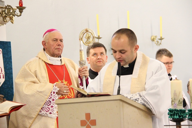 Relikwie bł. ks. Jerzego Popiełuszki zostały przyniesione w procesji z darami przez przedstawicieli rodziny zmarłego ks. prof. Antoniego Lewka.
