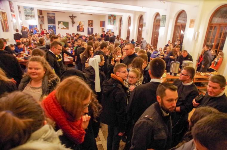 Po uczcie duchowej przyszedł czas na coś dla ciała. Każdy uczestnik mógł poczęstować się drożdżówką w jadalni pielgrzyma, która wypełniła się w ten wieczór po brzegi. Ostatnim punktem dnia była adoracja Pana Jezusa w Najświętszym Sakramencie, która była okazją do zgłębienia historii Jonasza i odniesienia jej do swojego życia.