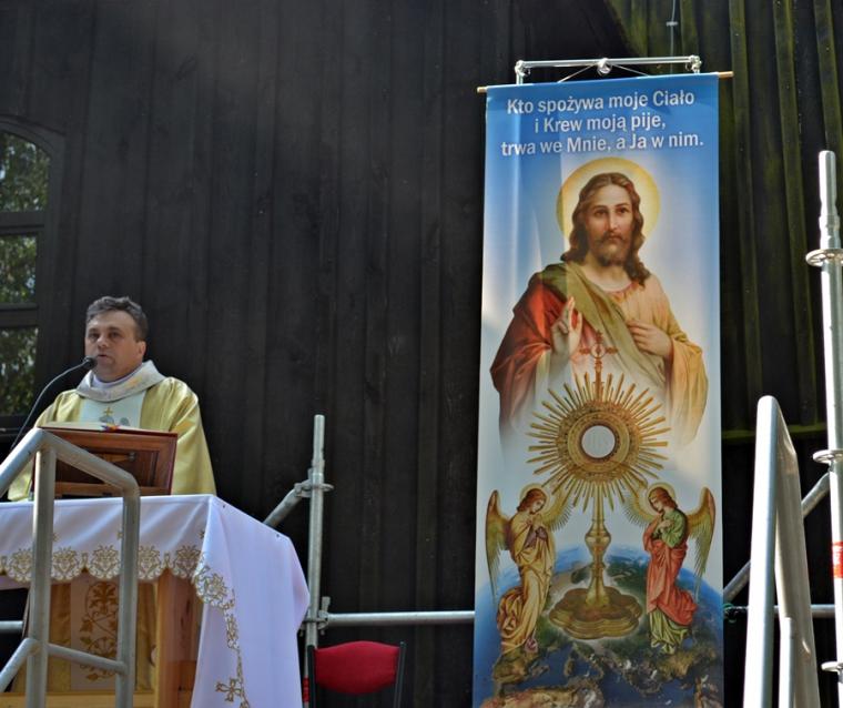 31. maja obchodziliśmy Uroczystość Najświętszego Ciała i Krwi Pańskiej. Jest to dzień wyjątkowy w życiu Kościoła, ale także w życiu każdej wspólnoty parafialnej. . W tym szczególnym dniu Jezus ukryty pod postacią chleba w Najświętszym Sakramencie opuszcza kościół, by przemierzając ulice miast, miasteczek, wiosek zobaczyć, jak się powodzi Jego dzieciom. W mikstackiej wspólnocie parafialnej uroczysta suma, po której ulicami miasta wyruszyła procesja do czterech ołtarzy została odprawiona przy Diecezjalnym Sanktuarium Świętego Rocha o godz. 9:00. Przewodniczył jej ks. kan. Krzysztof Ordziniak, kustosz sanktuarium, współcelebransem był ks. wikariusz Krzysztof Lipiński. Ksiądz proboszcz polecał w Eucharystii wszystkich parafian, tych którzy przygotowywali ołtarze oraz tych, którzy będą obsługiwali procesje. Homilię wygłosił ks. kan. Krzysztof Ordziniak. Rozpoczynając podkreślił, że dwa razy w ciągu roku Bóg opuszcza mury kościoła, by udać się do swoich dzieci. Czyni to w uroczystość Wszystkich Świętych, kiedy to idzie na cmentarze, by opłakiwać wraz z nami naszych bliskich, przyjaciół, znajomych. To drugie wyjście ma charakter radosny i ma miejsce właśnie w uroczystość Najświętszego Ciała i Krwi Pańskiej. W tym dniu- jak podkreślił celebrans przygotowujemy ołtarze, dekorujemy domy, aby przywitać Pana, nawiedzającego zagrody swoich dzieci. Kontynuując ks. kan. przywołał słowa pieśni „ Zróbcie Mu miejsce, Pan idzie z nieba…” zaakcentował, że wskazuje ona z jednej strony cel wyjścia Jezusa ze świątyni, ale także sposób w jaki powinniśmy czcić przyjście Pana. Kaznodzieja wskazał, że pieśń ta wskazuje dary jakie przynosi nam Pan. Zaznaczył, że udział w procesji jest wyznaniem naszej wiary. Przytoczył wydarzenie z czasów okupacji, kiedy to grupa więźniów udała się z obozu pracy do miasteczka eskortowana przez esesmanów. Po drodze spotkali kapłana jadącego z Wiatykiem do chorego. Wszyscy uklękli. Ów kapłan, jak wskazał celebrans, będąc pod wrażeniem takiej relacji więźniów zapisał w kronice mi. in. takie słowa: „Naród, który ma taką wiarę, nie może zginąć”. Ks. kan. Krzysztof zachęcał zebranych, by zapamiętali te słowa, ale także by czcili Chrystusa nie tylko pokłonem, ale także śpiewem. Podkreślił, że procesja nie jest pochodem niemych, a polskie pieśni eucharystyczne są niezwykle piękne. Przywołał przykład barwnych procesji Bożego Ciała odbywających się w Łowiczu, które zostały wpisane na Krajową Listę Niematerialnego Dziedzictwa Kulturowego, na której jak przypomniał ks. kustosz znajdują się także nasze uroczystości odpustowe ku czci św. Rocha połączone z obrzędem błogosławieństwa zwierząt.