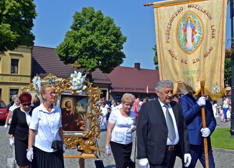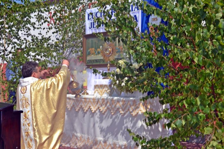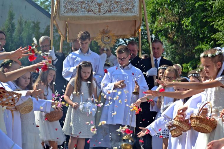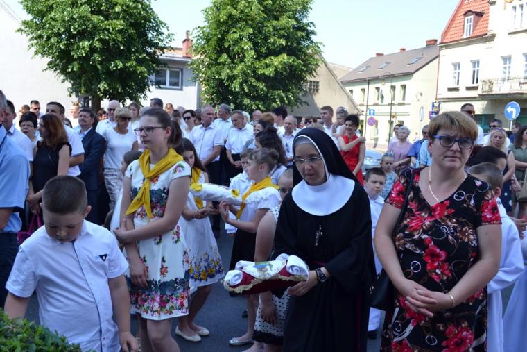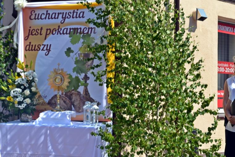 Wracając do głównego wątku rozważania kaznodzieja zachęcał wiernych do postawienia sobie pytania: „Co Jezus ukryty pod postacią Chleba, zobaczy w czasie wędrowania przez nasze miasto i parafię? Jaką zobaczy Ojczyznę, jaki Kościół, jaką rodzinę, jakiego człowieka?”. W dalszej części homilii celebrans podkreślił, że uroczystość Bożego Ciała jest wielkim pokłonem złożonym Jezusowi, ale jednocześnie zachęcał, by odpowiedzieć sobie na pytanie, czy zawsze oddajemy Bogu pokłon. Zaznaczył, że różnie z tym bywa. Myślą przewodnią rozważania były słowa pieśni „ Zróbcie Mu miejsce…”. Kończąc rozważanie ks. kanonik powiedział: „ Mam do Was ogromną prośbę w tym roku, abyśmy zrobili Bogu miejsce w naszych kalendarzach, które są tak mocno zapełnione różnymi sprawami”. Parafia podzielona jest na rejony, jak podkreślił ks. proboszcz nie tylko po to, by wywiązywały się one m.in. z organizacji procesji w poszczególnych dniach, ale i po to, by ich mieszkańcy w tych dniach uczestniczyli w Eucharystii. Jak odpowiemy na to zaproszenie? Czy zrobimy miejsce dla Pana w naszych sercach i w naszych kalendarzach. Tak wielu z nas przyjęło Jezusa w Komunii Świętej. Zrobiliśmy Mu miejsce w naszych sercach. Po Mszy Świętej odbyło się wystawienie Najświętszego Sakramentu, następnie wraz z Jezusem ukrytym pod postacią Chleba wyruszyliśmy w procesji do czterech ołtarzy. Przedstawiciele poszczególnych regionów przygotowali ołtarze. Trasa tegorocznej procesji wiodła od Diecezjalnego Sanktuarium Świętego Rocha do krzyża misyjnego przy naszej farze, której 100- lecie konsekracji przeżywać będziemy w październiku. Jak to już staje się tradycją w naszej wspólnocie co roku procesja odbywa się inna trasą, bo Jezus przychodzi do wszystkich. Przy poszczególnych ołtarzach wsłuchiwaliśmy się w rozważania, których myślą przewodnia była EUCHARYSTIA. Na pierwszym ołtarzu znajdowało się hasło: Eucharystia jest Ofiarą. W słowach rozważania usłyszeliśmy m.in. „ W opisie Eucharystii bardzo ważne są cztery czasowniki: brać, błogosławić, łamać, dawać. Dzięki nim możemy zaobserwować, na czym polega logika ofiary Jezusa”. O tym jak wielka jest tajemnica Boga i o Eucharystii jako pokarmie dla duszy mowa była w rozważaniu przy drugim ołtarzu. Na trzecim ołtarzu widniało hasło: „Eucharystia jest sakramentem zjednoczenia”. Tu do wiernych popłynęło przesłanie: „ Ten, który pokonał śmierć może wejść pomimo drzwi zamkniętych, pomimo zakrytych bielmem oczu i zatwardziałych serc. Wówczas, gdy On wychodzi nam naprzeciw , ukazuje się jako żyjący, dający życie”. Hasło na trzecim ołtarzu zachęcało nas do spojrzenia na Eucharystię jako zadatek nieśmiertelności. Tu wybrzmiało także Te Deum laudamus. Procesję zakończyło błogosławieństwo Najświętszym Sakramentem na cztery strony świata. Podczas procesji niesione były sztandary i feretrony. Uroczystość uświetniła orkiestr parafialna i chór. A tuż przed baldachimem kroczyły dziewczęta sypiące kwiatki. Było ich podczas tegorocznej procesji bardzo dużo. Jezus ukryty pod postacią Chleba przemierzał ulice naszego miasteczka obsypywany płatkami kwiatków.