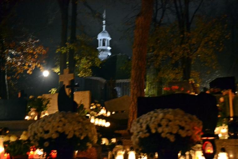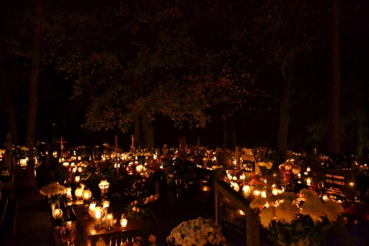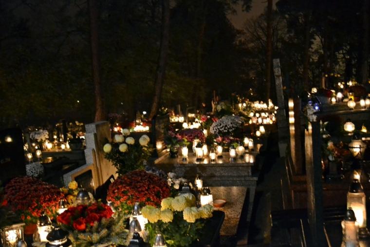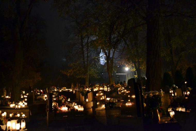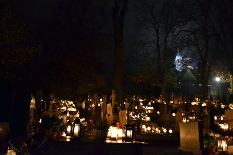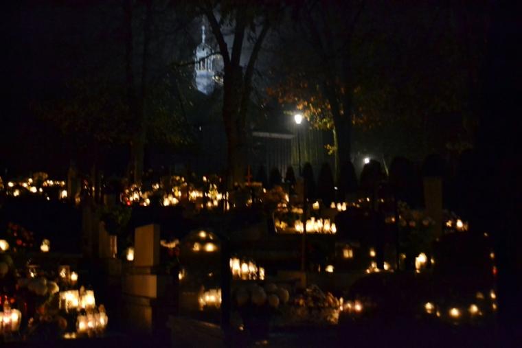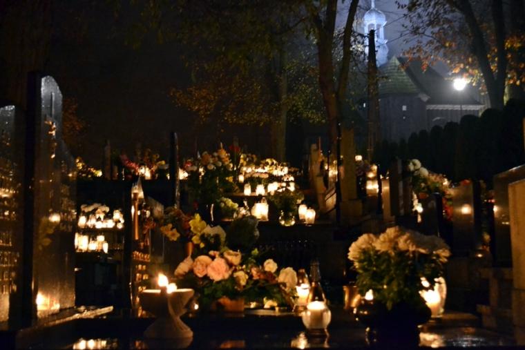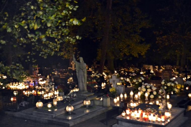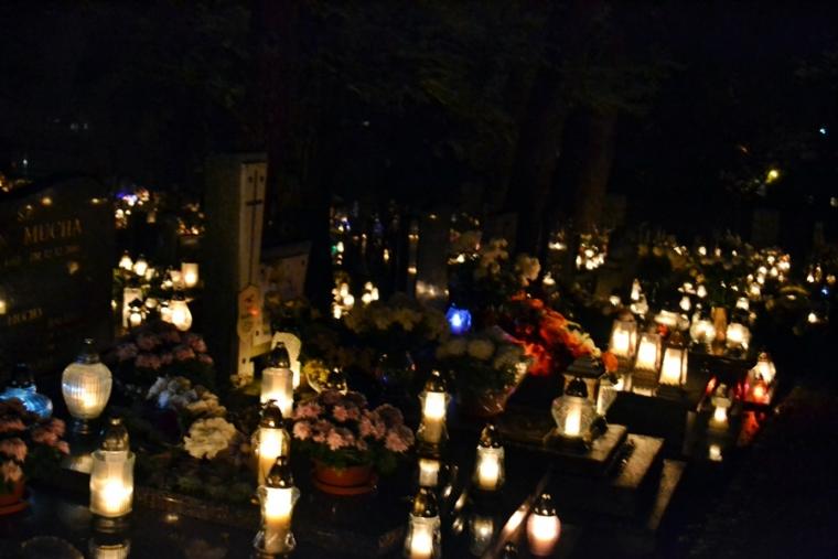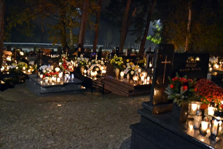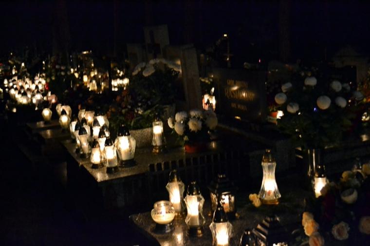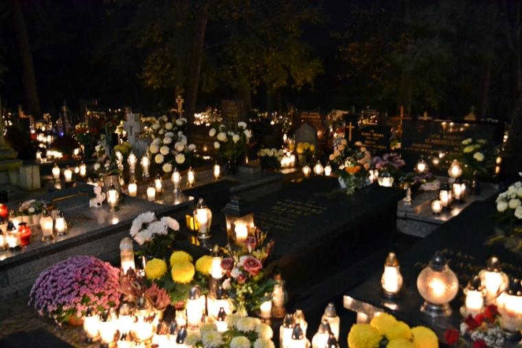 Głęboka w treści i zachęcająca do refleksji, ale i przemiany życia była ta przytoczona w rozważaniu legenda. Czy potrafimy odwiedzić, pocieszyć, dodać otuchy, być przy człowieku pogrążonym w smutku, płaczącym, biednym, głodnym, pragnącym sprawiedliwości. Czy potrafimy zdobyć się na zwykły ludzki gest? Być może to właśnie od tych zwykłych, pozornie nic nie znaczących gestów świadczących o miłości wobec bliźnich będzie zależało co usłyszymy od Boga, gdy przyjdzie nam zdać sprawę z naszego życia. Pan ofiarował nam czas, ale także przykład życia tak wielu świętych. Oni mogli osiągnąć świętość, możemy i my. Czy osiągniemy? Po Mszy Świętej alejkami wokół Sanktuarium wyruszyła procesja, podczas której przy pięciu stacjach modliliśmy się za zmarłych: kapłanów, biskupów, papieży, za rodziców, rodzeństwo, dziadków, krewnych, przyjaciół. Przy trzeciej stacji modlitwą objęliśmy zmarłych parafian, sąsiadów. Nie zabrakło także modlitwy w intencji tych, których miejsca wiecznego spoczynku nie znamy, a także za tych którzy zginęli obozach koncentracyjnych. Przy piątej stacji modliliśmy się za wszystkich zgromadzonych na cmentarzu prosząc dla nich o pragnienie osiągnięcia świętości. Modlitwą objęta została także ta osoba, którą jako pierwszą spośród zebranych Pan powoła do siebie. Nie wiemy kto to będzie, to wie tylko Bóg. Niewątpliwie modlitwa przy tej stacji stanowiła okazję do tego, by zadać sobie pytanie- czy jestem przygotowany ( przygotowana) na spotkanie z Panem. Uroczystość uświetniła orkiestra parafialna. O godz. 19:00 w sanktuarium spotkaliśmy się na modlitwie różańcowej połączonej z wypominkami. Mimo padającego deszczu jeszcze w późnych godzinach wieczornych wielu przemierzało cmentarne alejki, zatrzymując się przy grobach bliskich, przyjaciół, znajomych. Ofiarowana modlitwa, położone na grobach kwiaty, płonące lampki są dowodem na to, że o nich pamiętamy…