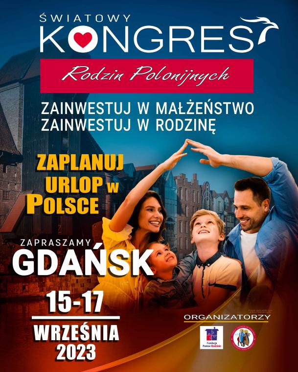 W dniach 15-17 września 2023 roku odbędzie się w Gdańsku VI Kongres Rodzin Polonijnych zatytułowany ”Zainwestuj w małżeństwo. Zainwestuj w rodzinę”. Referaty przygotowywane przez specjalistów w zakresie tematyki rodzinnej dostarczą uczestnikom wielu cennych informacji o tym jak budować szczęśliwe rodziny. Udzielą także odpowiedzi na pytanie jak można pomóc rodzinom w sytuacji trudności i zagrożeń. W ramach Kongresu przewidziane są także warsztaty w grupach, w ramach których uczestnicy będą mogli uzyskać kompetentne wsparcia w wypełnianiu podstawowych zadań rodzinnych np. w zakresie umacniania relacji małżeńskich, realizacji zadań prokreacyjno-wychowawczych, czy pomocy specjalistycznej w sytuacjach trudnych.