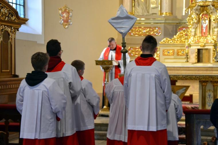 Liturgii Wielkopiątkowej przewodniczył ks. kan. Krzysztof Ordziniak. Niezwykła cisza i modlitewna zaduma zapanowała w kościele, gdy kapłan w tzw. geście właściwym Wielkiego Piątku leżał krzyżem przed ołtarzem. Podczas liturgii wielkopiątkowej odczytany został opis Męki i Śmierci Pana Jezusa. Podczas liturgii wielkopiątkowej kilka słów refleksji na temat krzyża w życiu człowieka skierował do licznie zebranych w świątyni wiernych ks. kan. Krzysztof. Kapłan zaakcentował, że Wielki Piątek jest dniem krzyża. Wskazał, że Kościół zatrzymuje się, aby ukazać ludziom cenę, za jaka Chrystus nas zbawił. Dodał jednak, że milczenie Wielkiego Piątku nie jest milczeniem rozpaczy, ale zadumy i refleksji nad miłością, która jest zdolna do największej ofiary. Kaznodzieja zachęcał zebranych do modlitwy i postawienia sobie pytania, czy potrafimy przyjąć krzyż. Krzyż, jak podkreślał, stoi w centrum Liturgii. Zwrócił uwagę na obnażony ołtarz, na którym brakuje obrusów, świeczników, kwiatów. Był natomiast pewien bardzo ważny gest. Powiedział: „celebrans(…) padł na twarz. To przejmujący znak modlitwy księdza leżącego na posadzce kościoła- jak podczas święceń kapłańskich. Trochę tak, jakby liturgia chciała nam przypomnieć, że bycie księdzem, bycie chrześcijaninem, jest powiązane z wejściem w tajemnicę Krzyża”. W dalszej części rozważania kapłan przywołał obraz znajdujący się w starym klasztorze. Przedstawia on Jezusa niosącego wielki krzyż, a wokół Niego wielu ludzi z małymi krzyżykami w ręku. Kapłan wskazał, że każdy człowiek ma swój krzyż. Podkreślił, że autor tego obrazu chciał ludziom przypomnieć słowa Chrystusa: „ Jeśli kto chce pójść za Mną, niech się zaprze samego siebie, niech weźmie krzyż swój i niech Mnie naśladuje”. Kontynuując, ks. proboszcz Krzysztof podkreślał potrzebę podjęcia swego krzyża i podążania z nim za Chrystusem. Wskazał na wielorakość i różnorodność krzyży, które trzeba przyjąć w swoim życie. Jest ich tak wiele, jak wielu jest ludzi. Zwrócił uwagę na krzyż samotności, zdrady, odrzucenia, choroby, nieszczęśliwych wypadków, śmierci bliskich. Kontynuując powiedział: „Krzyż ma wiele imion. Jedno jest pewne: trzeba podjąć swój krzyż, aby upodobnić się do Chrystusa. Kto nie bierze swego krzyża, nie jest Mnie godzien - mówi Jezus”. Kapłan zwrócił uwagę wiernych, że aby zrozumieć i podjąć swój krzyż, trzeba zrozumieć krzyż Chrystusa. To z niego mamy czerpać siłę i moc. W końcowej części rozważania kapłan przywołał postać Karola Antoniewicza, autora pieśni: „ W krzyżu cierpienie, w krzyżu zbawienie…”. Wskazał trudne koleje jego życia: śmierć dzieci, żony. Jego żona w czasie choroby mówiła do niego: „Karolu, trzeba głośno dziękować, a cicho cierpieć”. Po jej śmierci wstępuje do jezuitów. Ma dar przemawiania do cierpiących. W czasie epidemii z wielkim oddanie posługuje chorym. Sam się zaraża i tuż przed śmiercią pisze pieśń „ W krzyżu cierpienie, w krzyżu zbawienie, w krzyżu miłości nauka…”
