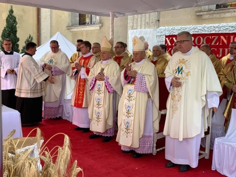 który przewodniczył Pontyfikalnej Sumie Odpustowej i dziękczynnej za tegoroczne plony podczas dożynek diecezjalno ~ powiatowych w Lutogniewie. Uroczystość połączono z dziękczynieniem za XX Rocznicę Koronacji Obrazu Matki Bożej Pocieszenia. Do Sanktuarium Matki Bożej Pocieszenia od wczesnego rana przybywali pielgrzymi w pieszych i autokarowych pielgrzymkach wraz ze swoimi duszpasterzami z terenu całej diecezji kaliskiej. Przed Eucharystią biskup kaliski Edward Janiak obejrzał wieńce dożynkowe przywiezione przez delegacje rolników z trzydziestu trzech dekanatów diecezji kaliskiej. Biskup podziwiał trud pracy, który rolnicy włożyli w przygotowanie wieńców. Mszy świętej dziękczynnej przewodniczył pierwszy biskup kaliski Stanisław Napierała. Wraz z Nim modlili się biskup kaliski Edward Janiak, ks. kan. Łukasz Żurawski, kustosz Sanktuarium Matki Bożej Pocieszenia w Lutogniewie. W swoim słowie biskup kaliski wspominał, że 20 lat temu jako biskup pomocniczy archidiecezji wrocławskiej uczestniczył w uroczystości koronacji obrazu Matki Bożej Pocieszenia. „Księże Biskupie Stanisławie to Twoim staraniem te korony otrzymała wtedy Matka Boża.” ~ powiedział biskup kaliski Edward Janiak.