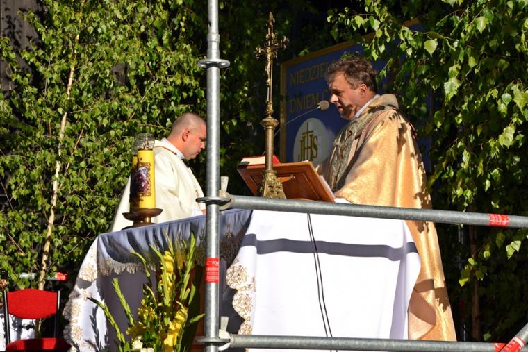 Zaakcentował, że zgromadził nas Boży Stół, na którym Jezusa jako Chleb kładzie nam samego siebie. Celebrans zwrócił uwagę, że powinniśmy Mu za to dziękować, wielbić Go, ale przede wszystkim ufać jego dobroci. Zaznaczył jednak, że nasza wdzięczność jest niepełna jeśli nie potrafimy na Boże miłosierdzie odpowiedzieć miłosierdziem wobec bliźnich. Kończą kaznodzieja powiedział: „Boże miłosierdzie to wielka „ słabość” Boga do człowieka, ale dzięki tej „słabości” istniejemy. Ona nam mówi, że Bóg nie zmęczył się człowiekiem, dzięki niej doświadczamy Jego dobroci, przebaczenia. To właśnie dzięki tej „słabości” Bóg wciąż na nowo lituje się nad człowiekiem, troszczy się, okazuje miłosierdzie i prosi zacznij od nowa”.